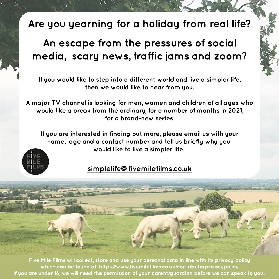 Five Mile Films are making a brand-new documentary series later this year, for a major UK TV channel, about living a simpler life and are looking for families, couples and individuals of all ages, backgrounds and experiences to apply – to take time out from their regular life and step into a different way of living.